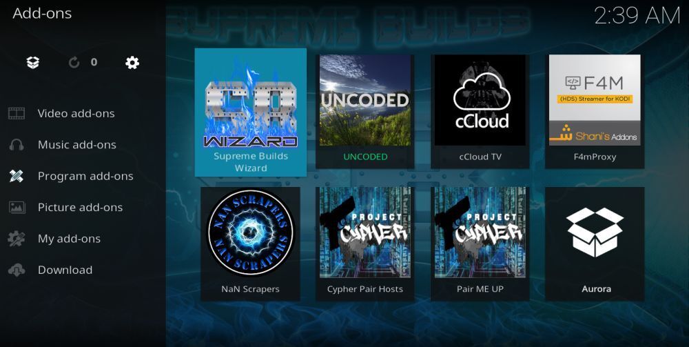 - At this point, the Supreme Builds Wizard should run automatically. If it doesn’t, go back again to the Kodi Home Page and select Addons once more. This time click on Programme Addons. Here you should find the Supreme Builds Wizard ready to use.