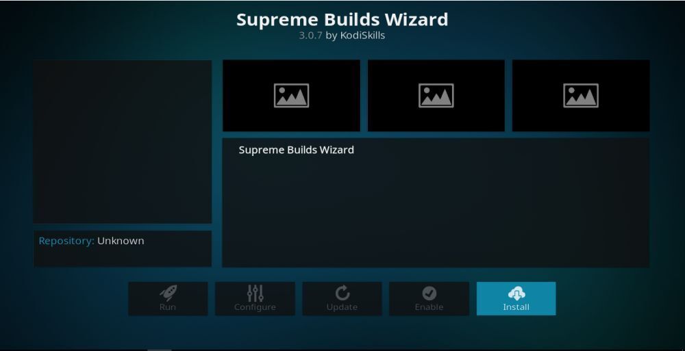 - Open the Repository and click on the Programme Addons followed by the Supreme Builds Wizard. Click Install to download and install the Wizard on your Kodi system. Again, you will receive a notification in the top right of the screen when this process has been successfully completed.