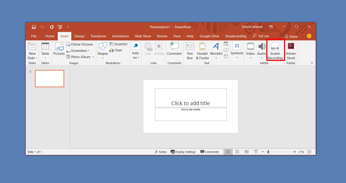 Open a Microsoft PowerPoint presentation and go to the Insert tab. At the far right, on the media set of tools, click the Screen Recording button.