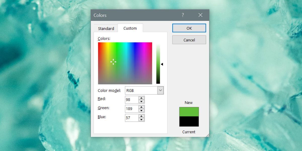 A new window will open with more colors but they will still be limited. This window has two tabs; Standard, and Custom. Go to the Custom tab and select a different color from the full color spectrum tool. You can use the RGB fields to set a specific color if you have its RGB value.