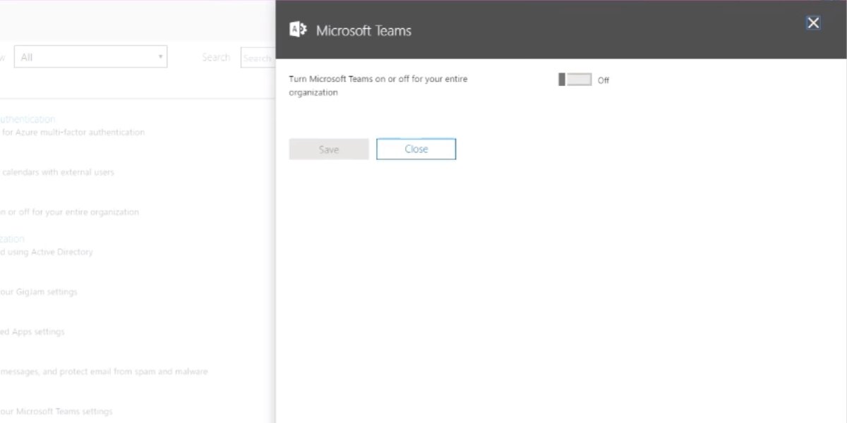 - In the panel that opens, make sure Microsoft Teams is On for your organization.