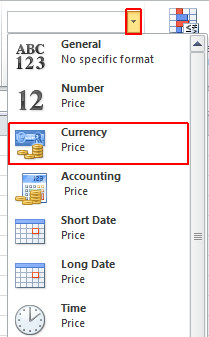 Now we want to convert values in Price field into Currency values. For this select the desired field and navigate to the Home tab, from Number group, click drop-down button and select Currency.