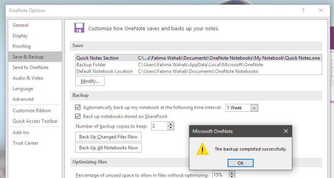 Click the ‘Back Up All Notebook Now’ button below this option and OneNote will save the backup this time around. A confirmation message appears on your screen to let you know the backup was created successfully.