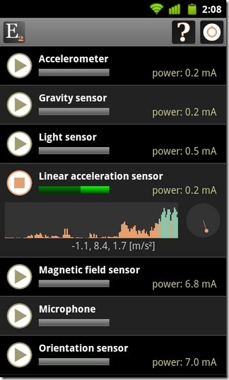 The proximity sensor, microphone, magnetic field sensor, accelerometer and other sensors running on your device can also be viewed and tested through Elixir 2. The app also allows you to check Logcat log (process log used for debugging) and Dmesg log (prints the message buffer of the kernel) of your Android.
