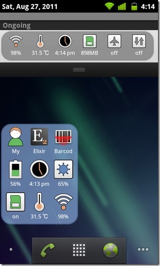 You may also create widgets for APN, Wi-Fi, Bluetooth, airplane mode, auto-sync, SD mount (refresh), silent, screen lock, auto-brightness and others. In addition, the app lets you create customized statusbar widgets that can be pulled down from the notifications drawer to access/toggle various functions/options.