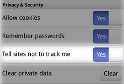 The Do Not Track option, when enabled, prevents websites from making a log of your actions (usually done for survey purposes). To enable said feature, go to Menu > Preferences and enable the option labeled Tell sites not to track me. You can access the same menu by swiping left and across the screen and tap the little cogwheel icon at the bottom of the side bar that appears.