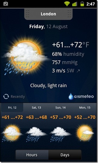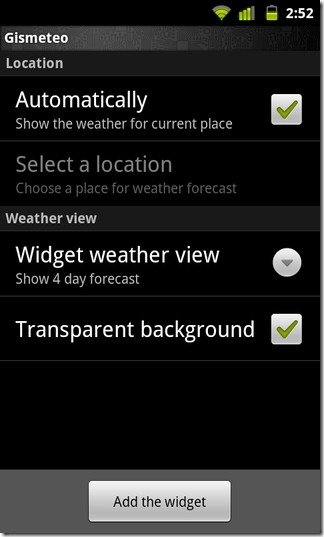 Gismeteo comes with a home screen widget that can be modified to display current weather or a 4-day weather forecast of a selected region. Gismeteo Weather Forecast Lite is available in the Android Market free of cost and should work on most Android devices. You can download Gismeteo Weather Forecast Lite from the Market link provided below.