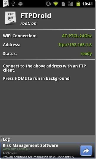 FTPDroid is yet another free (ad supported) app meant to turn your device into an FTP server, but contrary to most FTP server apps FTPDroid is an extremely secure client allowing checks on anonymous access, restricted access to personal folders and an extensive log history.