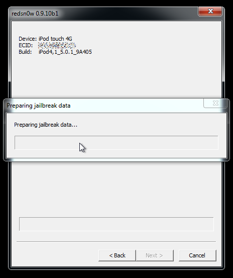 - Once the device is identified, redsn0w will start preparing the jailbreak data and performing the relevant operations. Sit tight.