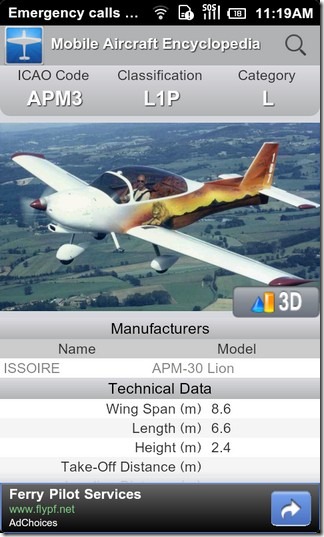 Tap the Aircraft List button on app’s homescreen to enter the aircraft encyclopedia. Advanced manufacturer information such as name of the aircraft, its model, ICAO Code, classification and category is provided for each item along with physical attributes and performance-oriented technical data (speed, rate etc.). Tapping the 3D button displays aircraft sketches so that you can check out its design from various angles (front, top and side).