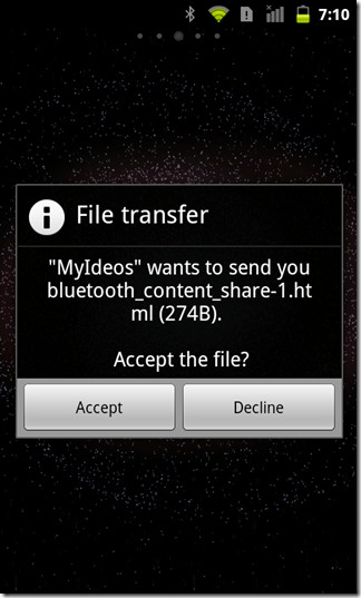 All the received APK files via Bluetooth are saved in the default Bluetooth directory on the SD Card of your Android device (i.e. /mnt/sdcard/bluetooth). Make sure that you do not violate the redistribution rights of any registered apps. Also, avoid sharing apps from unverified developers to protect your device from malicious intrusions.