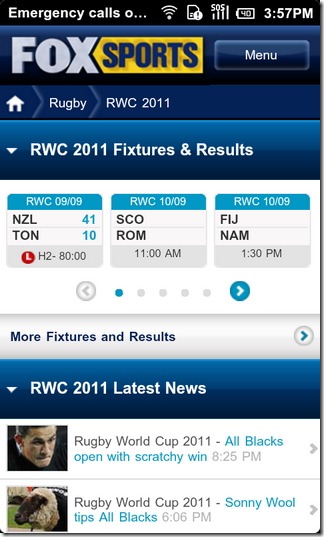 If you somehow missed out on the official Rugby World Cup 2011 client for your Android or if you wish to get comprehensive coverage of one of the most prestigious sporting events through one of the pioneering sports news service, then you do not need to look any further than this app. Dedicated exclusively to said event, FOX Sports Rugby World Cup features detailed coverage of all the 48 scheduled matches and will bring you up to the minute information regarding each. As evident from various screenshots, the app sports a neatly designed interface that makes navigation to its different sections a breeze.