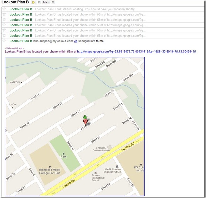 Each location mail notifies you of accuracy rating (in meters) to give you a good idea of the exact coordinates of your device. Remember that location is only sent to the Gmail address associated with your device. The mechanism remains active for 10 minutes and a new mail with fresh coordinates is received after frequent intervals. This particular feature of Plan B is useful to locate lost device that is moving constantly. By having your device location displayed on the map, you can trace it down easily. If you require to trace your device further, you can use another mobile and text the word ‘locate’ to your lost device. In return, you’ll receive a reply SMS from Lookout services that contains your phone’s precise location. The only caveat in successfully and remotely tracking your lost device via Plan B is that the internet connection must be enable on the device. Provided said condition is met, Plan B will automatically trigger the GPS on the device, and start transmitting the location at frequent intervals via mail.