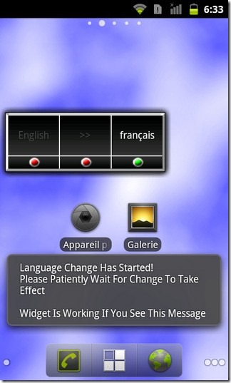 With Quick Locale, you can easily change the default language of your device. Anytime you wish to change the language, you can simply resort to the home screen widget instead of rushing through menus to the Language & Keyboard Settings screen in the settings menu. The app is quick to respond in most cases however, if you have loaded your Android device with excessive apps and widgets, switching among languages could take a couple of extra seconds. In either case, a notification message appears on your screen with a wait request while the selected language is being switched to.