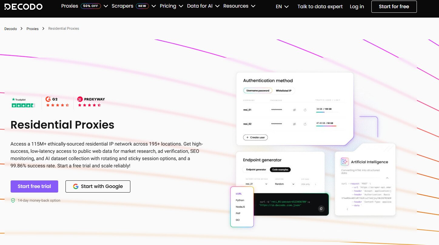 Decodo lists a response time of less than 0.6 seconds and a 99.68% success rate on its website, with ethically sourced IPs. There are no shared subnetworks, which reduces the risk of being banned, and you can launch unlimited connections. These residential proxies support both sticky and rotating sessions.