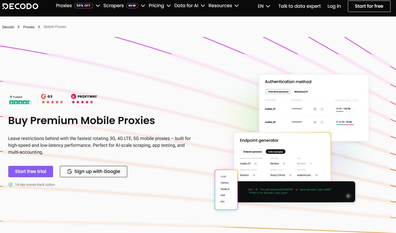 One of the premium products from Decodo is its Mobile Proxy service, which comes with a pool of 10 million IPs from 160+ locations and 700+ mobile carriers, supporting 3G/4G/5G. Thanks to a 99.99% uptime, 99.48% success rate, and quick response time (less than 0.8 seconds), this mobile proxy service offers great performance alongside reliable anonymity and city targeting.