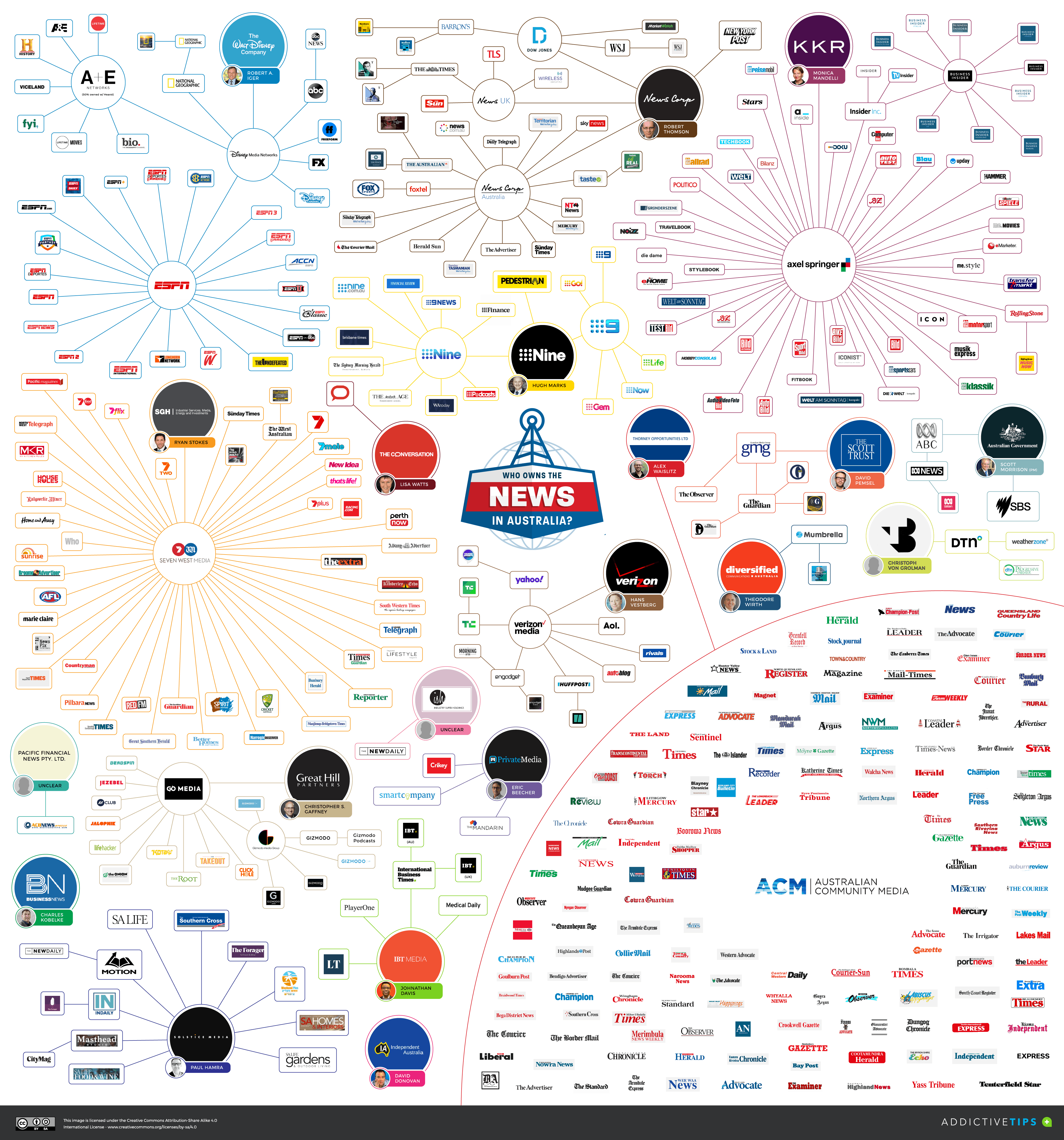 From 1987 to 2006, Australia had specific legislation limiting foreign ownership of media companies on the continent, as well as restrictions on cross-ownership of media companies meant to preserve the diversity of news media.[1] Despite these restrictions, today Australia has a relatively high degree of media concentration. National online news media in Australia is essentially controlled by two companies: News Corp, through News Corp Australia, and Nine. Rural news media is largely dominated by Australian Community Media, whose portfolio includes over 170 regional newspapers and their corresponding websites. The Conversation is one of the only major online news sites in Australia that is independently owned. Click here to explore who owns the news in Australia.