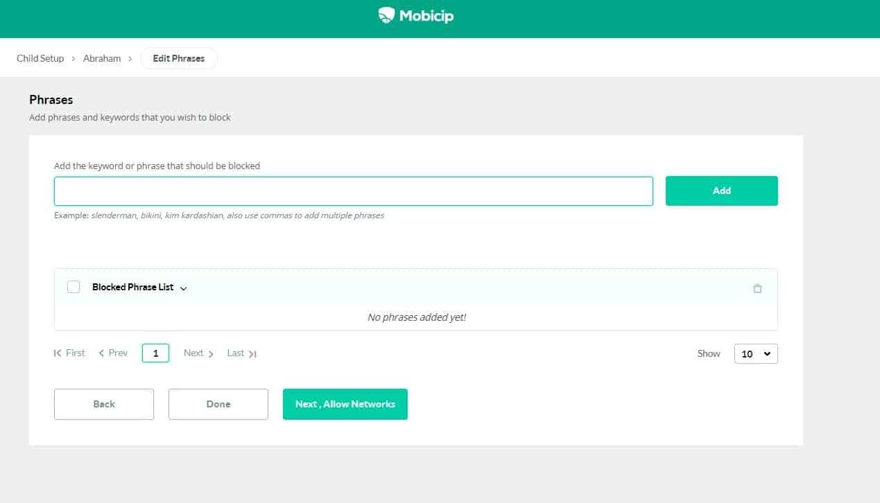 Mobicip goes a step further than site-blocking with a feature that blocks phrases from your child’s search. This follows the same design model as the website blocker tool. With this feature, you can block or allow certain phrases to a child’s browsing options. This means that similar search results to the sites you have blocked are also blocked from your child’s browsing.