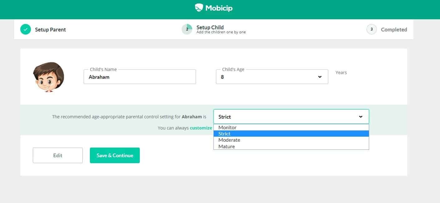 3. Choose the recommended age-appropriate parental control setting for the child – Monitor, Strict, Moderate or Mature.