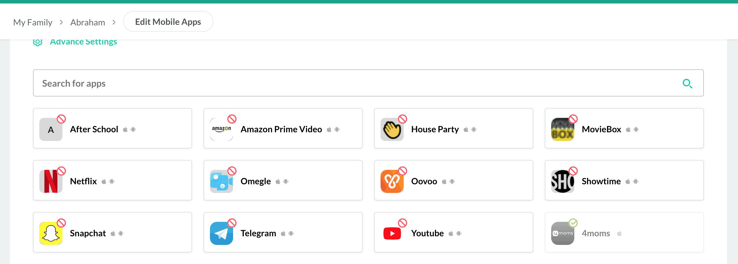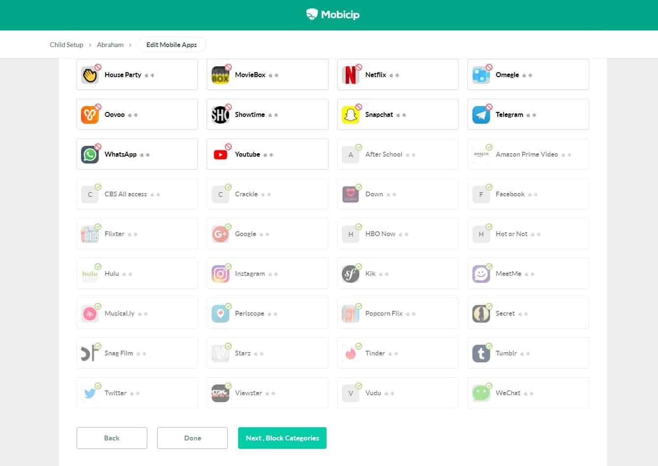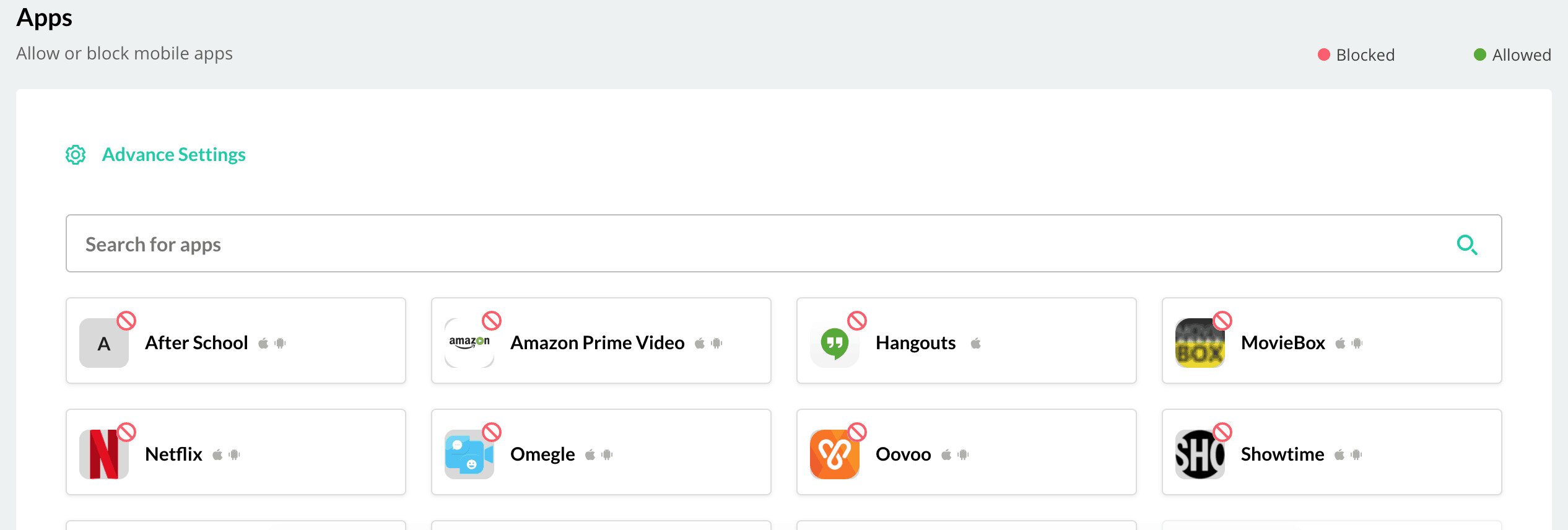 There is an advanced setting for mobile app blocking. It allows you to scroll through all the apps downloaded to a given device. Some of them were never submitted to Mobicip to define their “allow” or “blocked” status. By clicking on an allowed app that is not highlighted, you can block it.