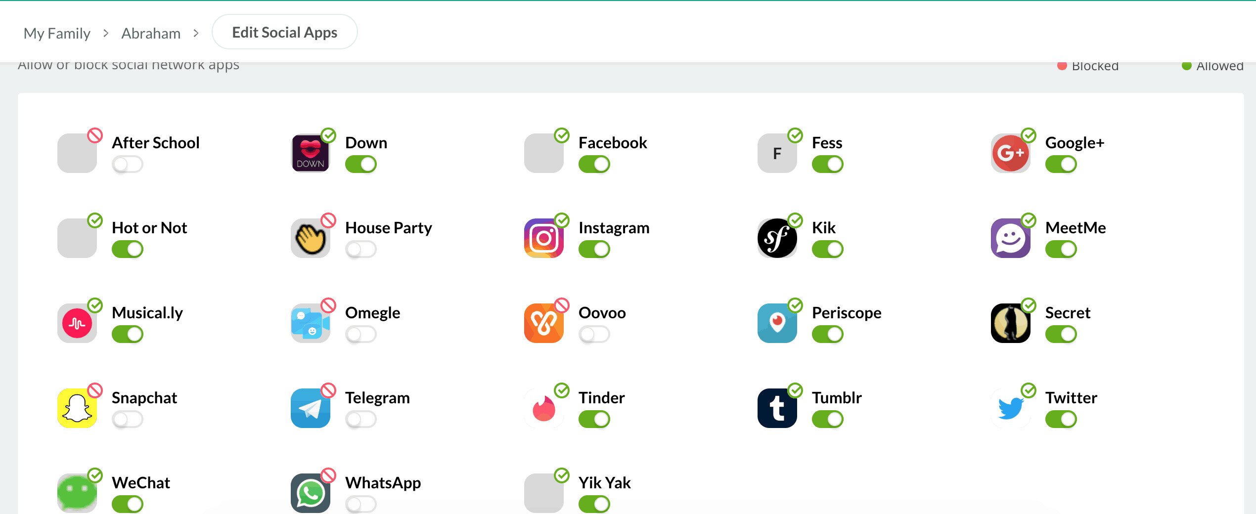 For this child’s profile, the green checks are apps that are okayed by the system. The red checks are those that are blocked. For this child, apps that encourage live video chat like Omegle, Whatsapp, Oovoo, Telegram, and Snapchat are blocked.