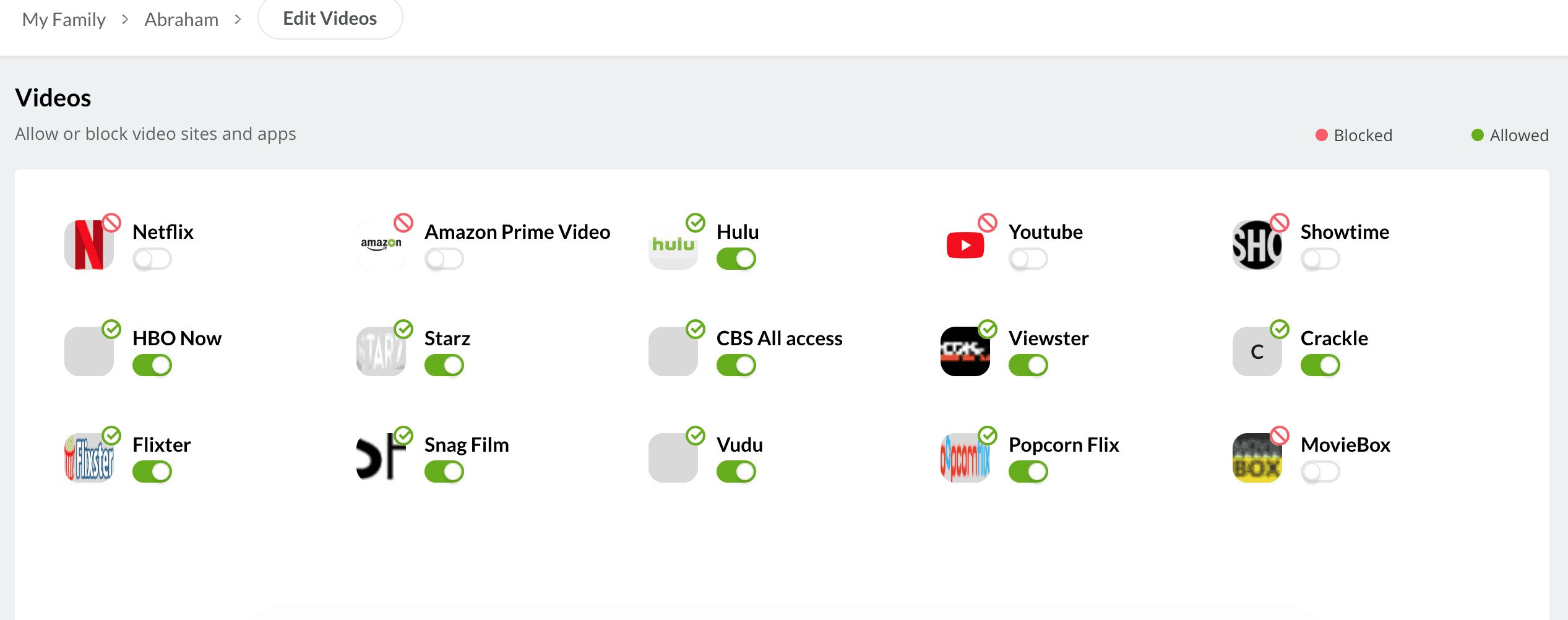 On this child’s profile, we see that the child’s parent has blocked Netflix, YouTube, Showtime, and MovieBox. They still have access to some other more customizable TV tools like Vudu, Amazon Prime, and more. This allows the parent to give their child streaming privileges that they can feel good about.