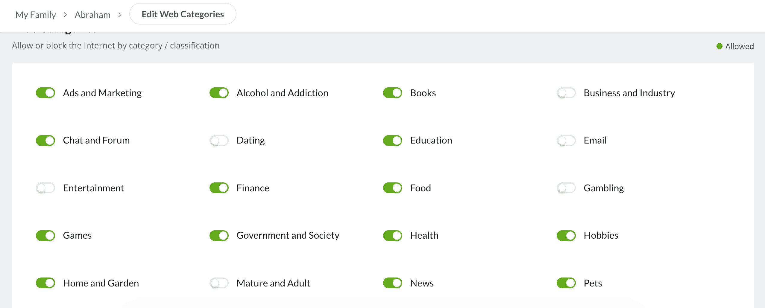 The toggle switch allows the parent to also change the status on a certain app. If your child downloads an app that your mature content blocker doesn’t catch, you still have the power to block it. For young children like the child in this profile, turning off apps like Tinder may be advisable.