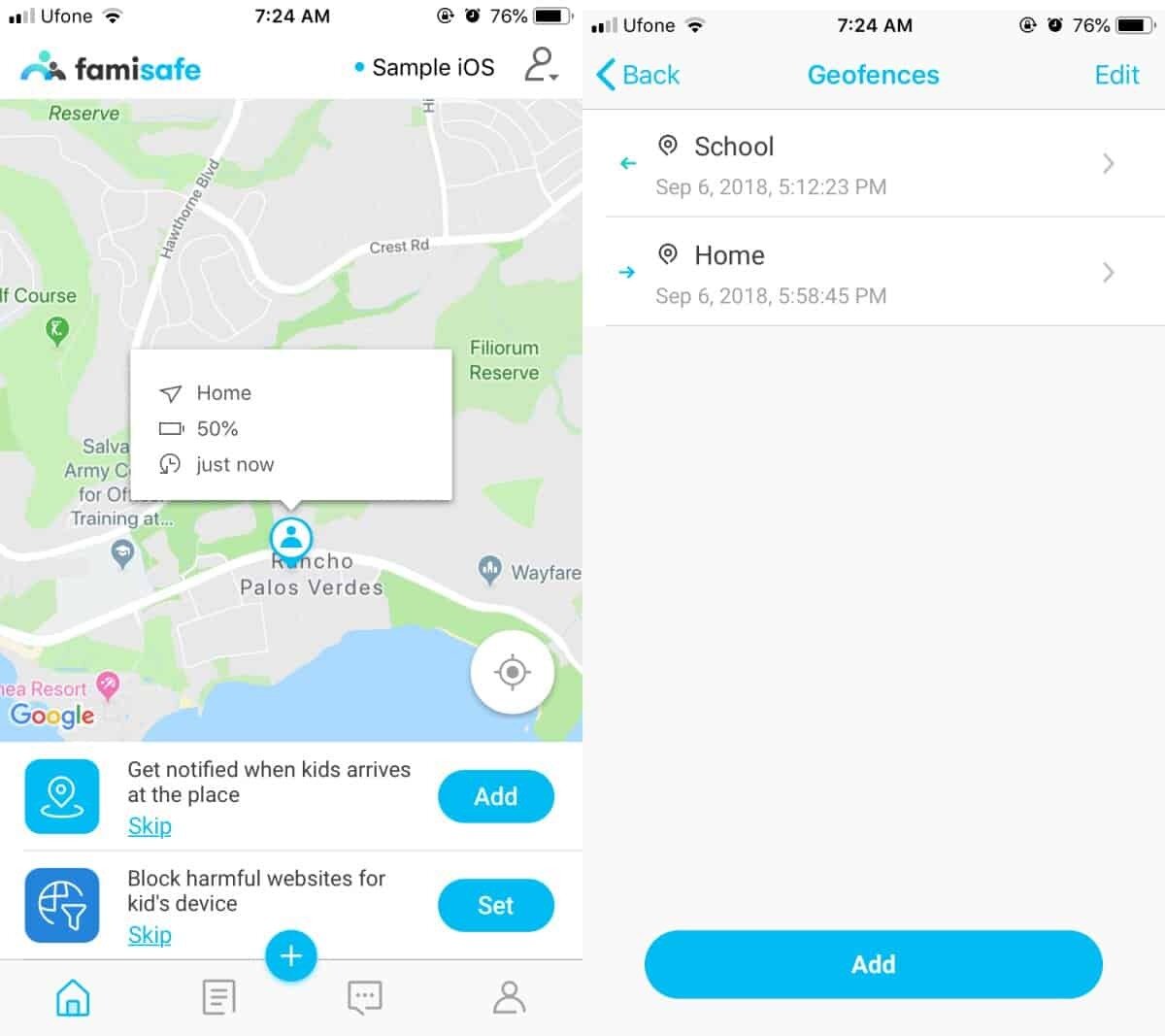 With Famisafe, parents can add several locations that are ‘safe’, and these locations can all be geo-fenced. Geo-fencing creates a smart, location based alert that tells you when a child arrives or leaves a location. You can add as many locations as you want for a device and also view a child’s current location. In addition to reporting location, the app can tell you if the monitored device is charged and how much battery it has.
