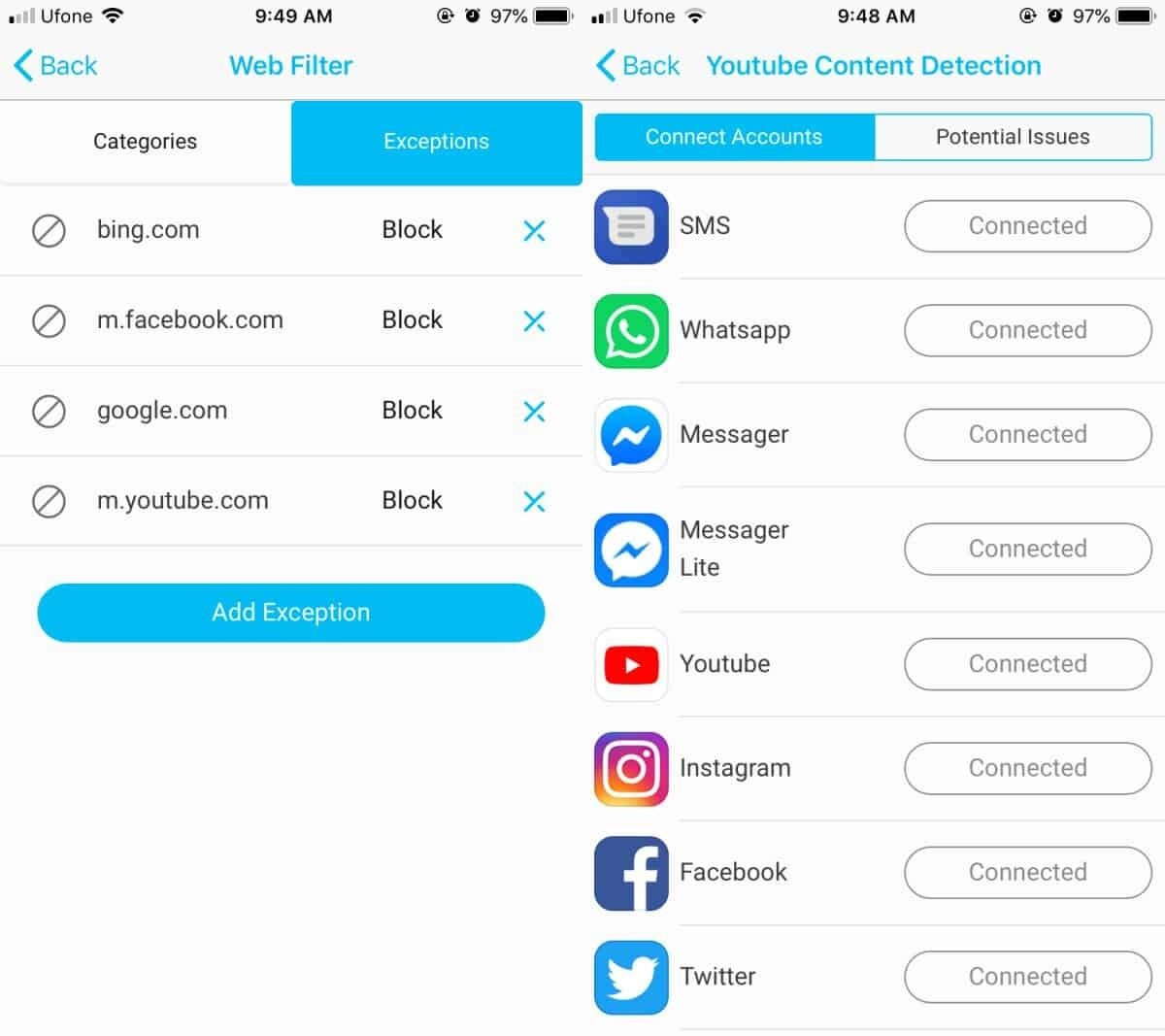 Additionally, the app can monitor messaging apps such as the SMS/MMS app on your child’s device, and other messengers such as Whatsapp and Facebook Messenger. Lastly, it allows you to connect social media accounts for Facebook, Twitter, and Instagram, among others to keep a check on what kind of content a child is interacting with.