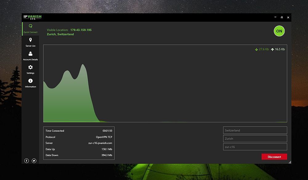 IPVanish has an excellent kill switch feature. It’s not turned on by default, so as soon as you open the software make sure you go to Settings > Connection and tick the box next to “kill switch”. When it’s active you’ll see a note just below the green “on” button in the corner of the screen. With the kill switch active you can manually disconnect and switch servers as normal, but in the event of a force disconnect it immediately puts a plug in your network connection so nothing gets out.
