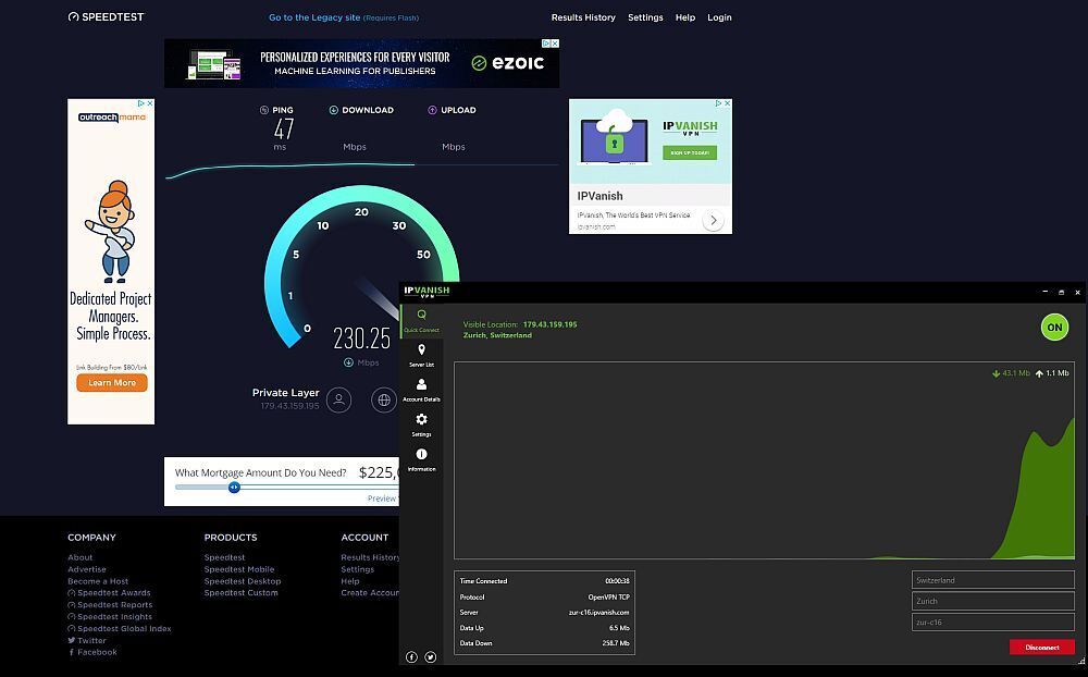To make our results as reliable as possible we deployed four unique tests three times each throughout the day. Each one used a different method for recording and gauging speed. We always tested our raw ISP speed immediately before the VPN’s speed, and when connecting to the VPN we chose the closest server and used the fastest protocols available. For IPVanish this meant OpenVPN UDP on port 1143, as configured through the desktop software.