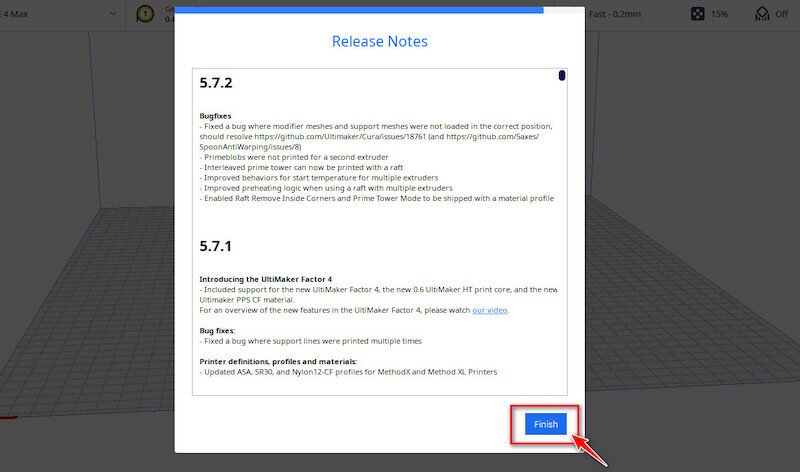 - You might see the “What’s New” page. Just click on the “Skip”. Then, if it’s the first time you’re opening the app, you’ll see the “Release Notes”. Click on the “Finish” button to complete the process of adding the Elegoo Neptune 4 Max Cura profile or any other printer model you have.