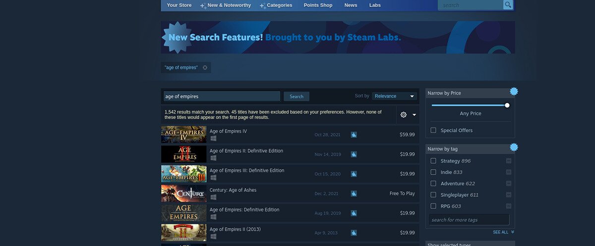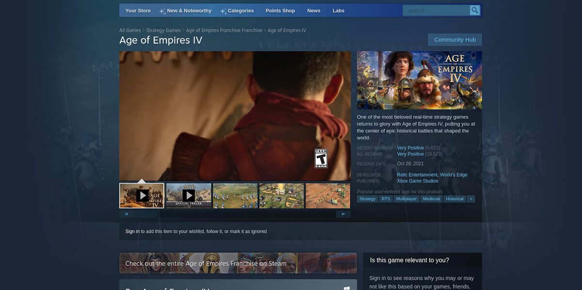 Look through the search results for “Age of Empires IV” and click on it to load up the game’s Steam store page.