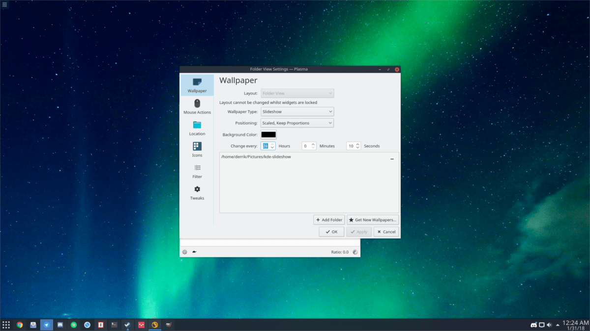 Select the “+Add folder” button at the bottom, and navigate to the ~/Pictures/kde-slideshow/. Then, go to the “change every” section to modify exactly how long KDE Plasma 5 should wait before changing to a different wallpaper in the folder.