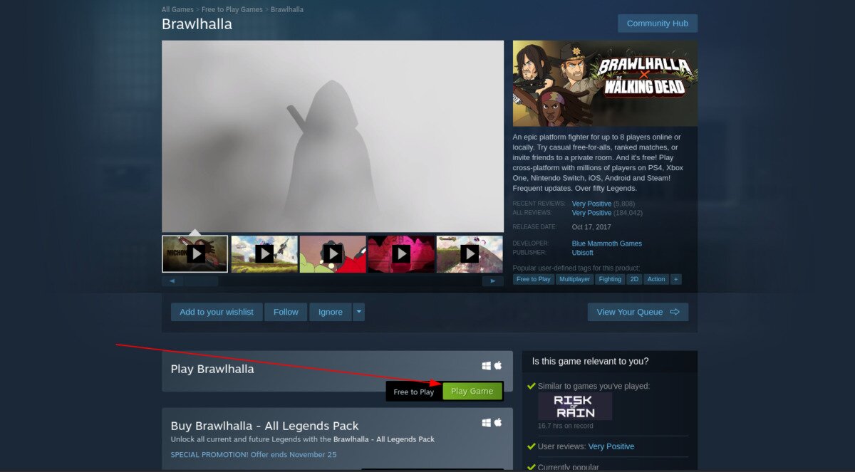 Step 3: On the Brawlhalla store page, find the green “Play Game” button. By selecting this button, you will be telling Steam to download and install it on your computer.