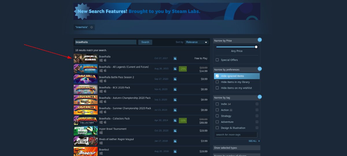 Step 2: Find the “STORE” button in Steam, and click on it to access the Steam Storefront. Then, find the search box, and type in “Brawlhalla. Look through the search results for “Brawlhalla” and select it to go to the Brawlhalla store page.
