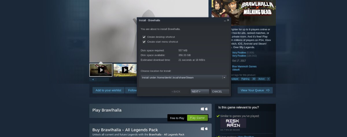Using the on-screen prompts, tell Steam where to install the game. Keep in mind that you can also check out the downloadable DLC on the Brawlhalla store page directly under the “Play Brawlhalla” button.