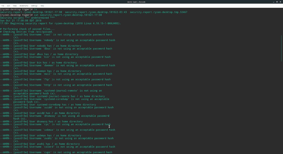 Let the tiger command run and go through the audit process. It will print out what it’s scanning, and how it is interacting with your Linux system. Let the Tiger audit process run its course; it’ll print out the location of the security report in the terminal.