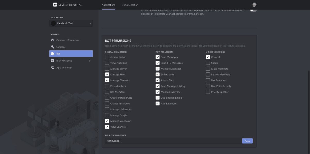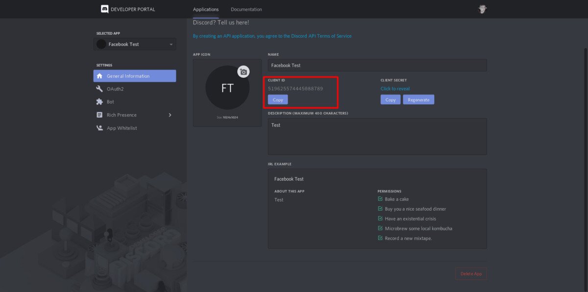 Step 3: Fill out the information for your new Facebook/Discord bot and copy “client” ID to a text file for later.