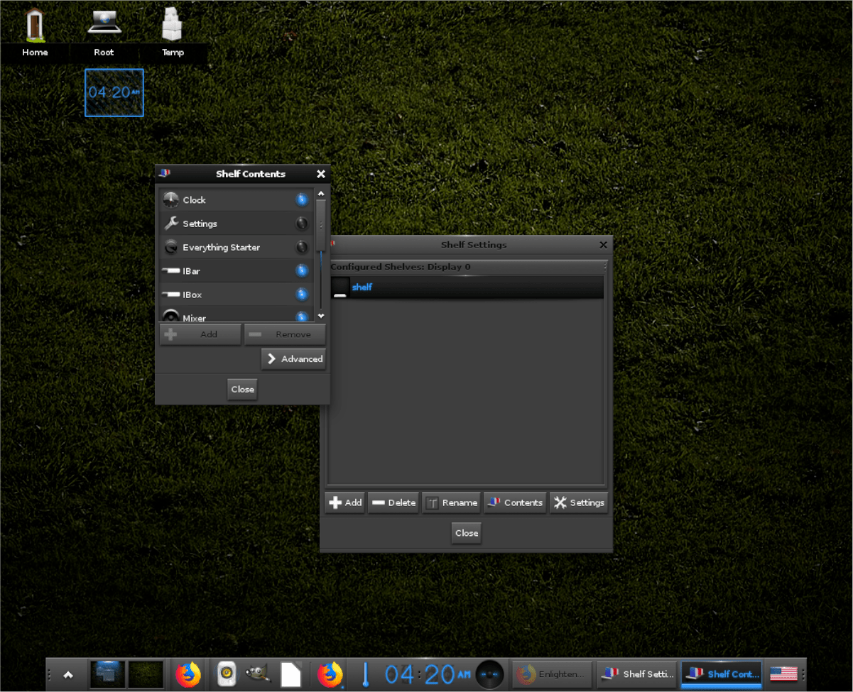 In Enlightenment, “Shelves” are similar to the panels on other desktop environments. On these “Shelves,” you’ll see various “Contents” AKA widgets. These widgets include the volume mixer, clock, temperature readout, etc.