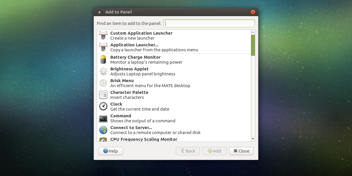 The default panel layout works, but it’s not the only way Mate has to look. Want to add new panel widgets? Right-click on a panel, and click the “add to panel” button to add new widgets from the widget menu. Additionally, delete existing widgets by right-clicking on them, and select “remove from panel”.