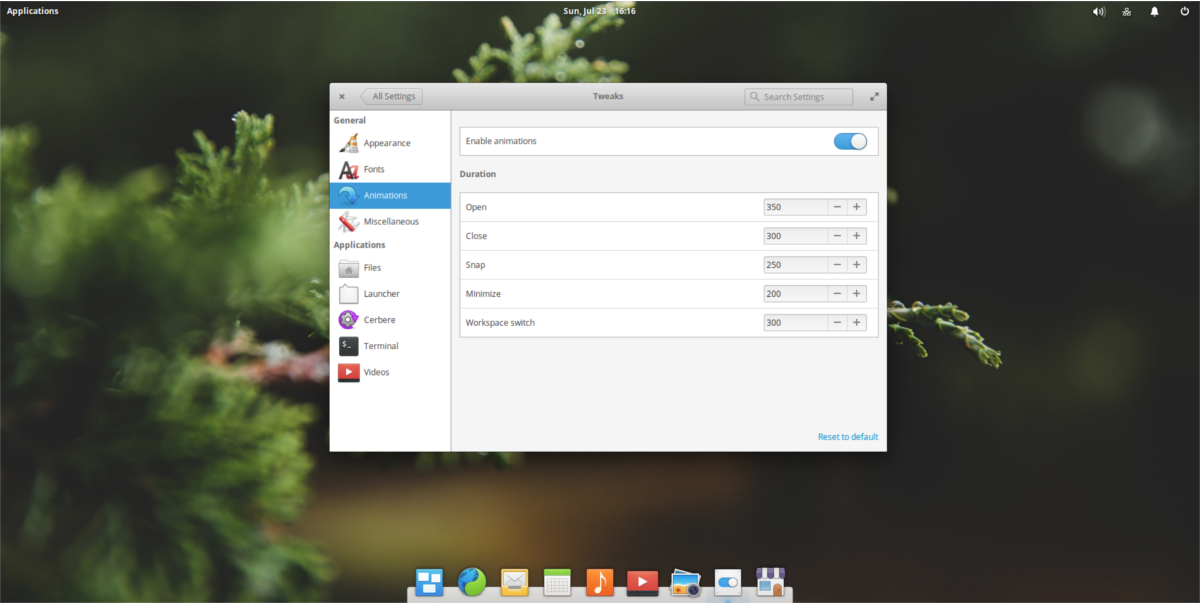 Elementary works well on most PC’s, but some may have a little trouble with it because of the graphical settings. Click on the Animation section in Tweaks, and click the button to enable or disable animations. Additionally, change the speed of animation under the Duration section.