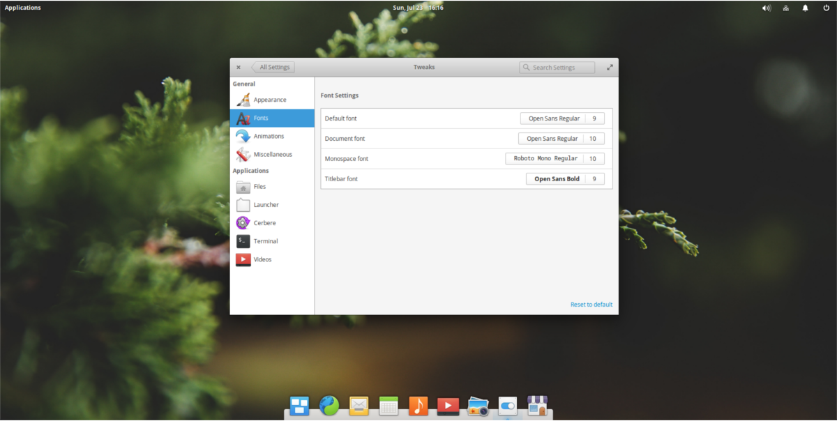 Elementary Tweaks allows users to change the system fonts. In Tweaks, click the Fonts section on the side. In the Font Settings area, users can change the default font, the document font, the monospace font, and the title bar font.