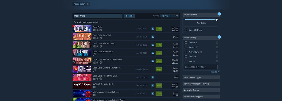 Step 2: Look through the Steam store search results for “Dead Cells.” Once you’ve located the game in the search results, click on it with the mouse. When you click on the game in the search results, Steam will load up the Dead Cells Steam store page.