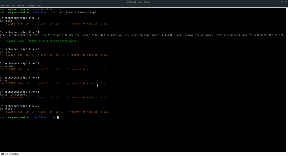 Immediately after the shellcheck command runs, it will detect issues with your code and put it in the terminal prompt. Read through and learn how to improve your programming by following the suggestions it gives you.