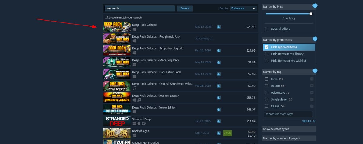 Press the Enter key on the keyboard to search. Then, look through the search results for “Deep Rock: Galactic” and click on it to access the game’s Storefront page.