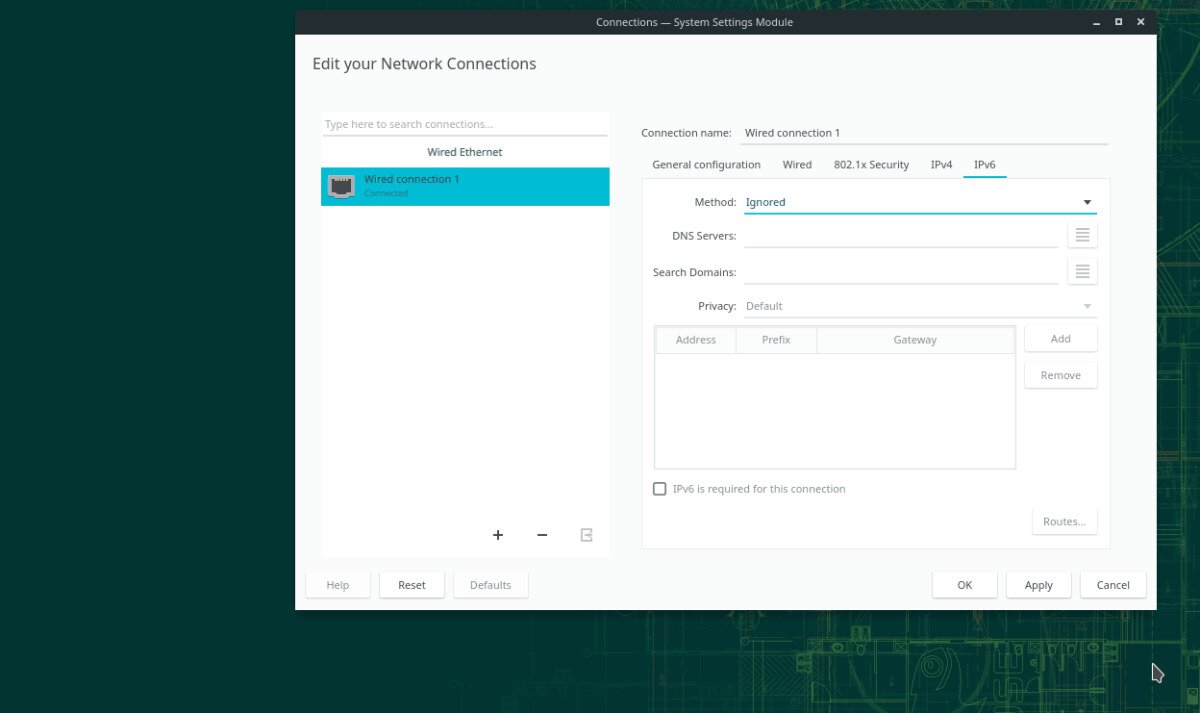 Like Gnome Shell, the KDE Plasma 5 Desktop environment gives users the ability to disable IPv6 right from the network interface settings.