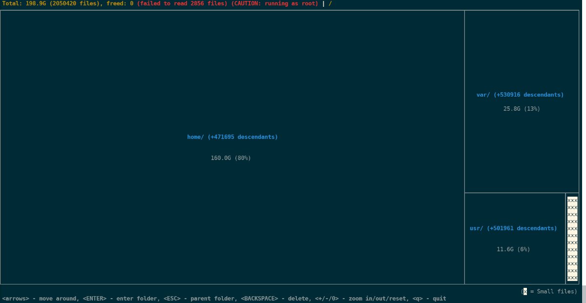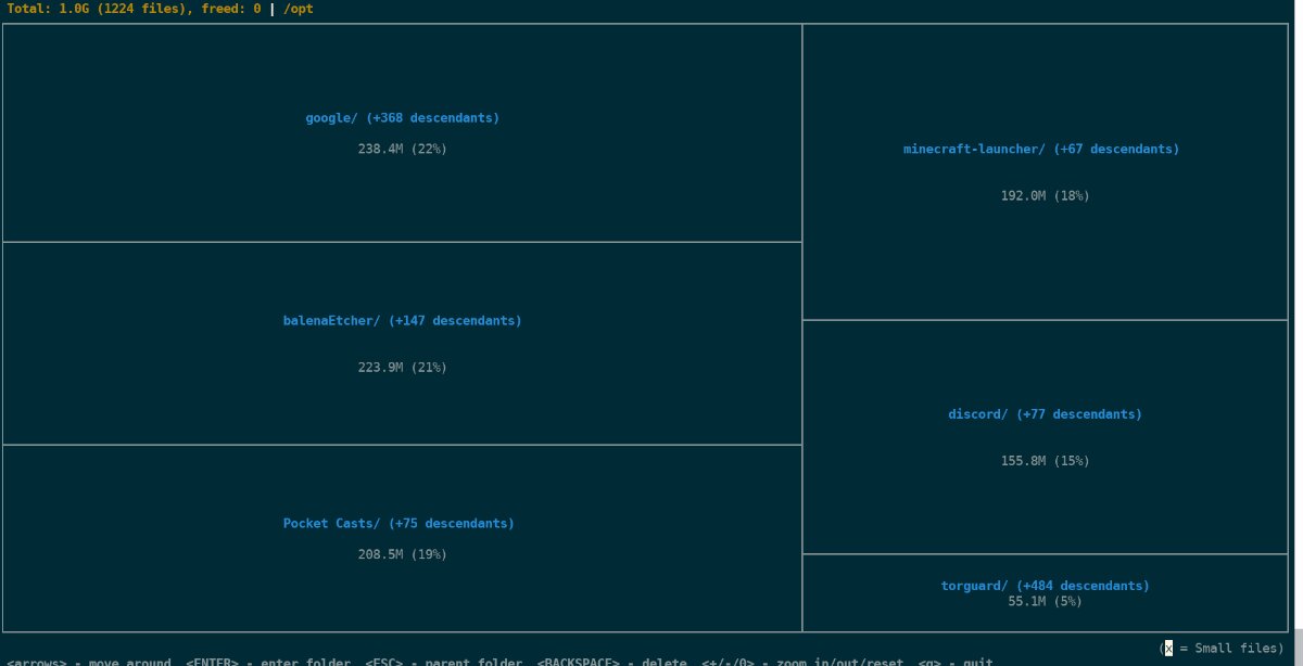 By running this command, Diskonaut will tell you what the biggest folders are on the system at a glance. If you would like to enter any of these folders, use the arrow key to select a folder, and the Enter key to access it.