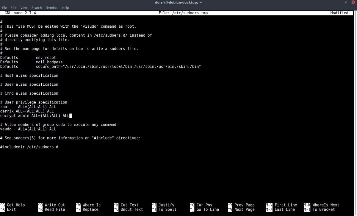 Encrypt-admin is ready to use, but will not be able to access and execute root commands. To allow the user to run root commands, we’ll need to add it to the sudoers file. Using visudo, edit the sudo config file.