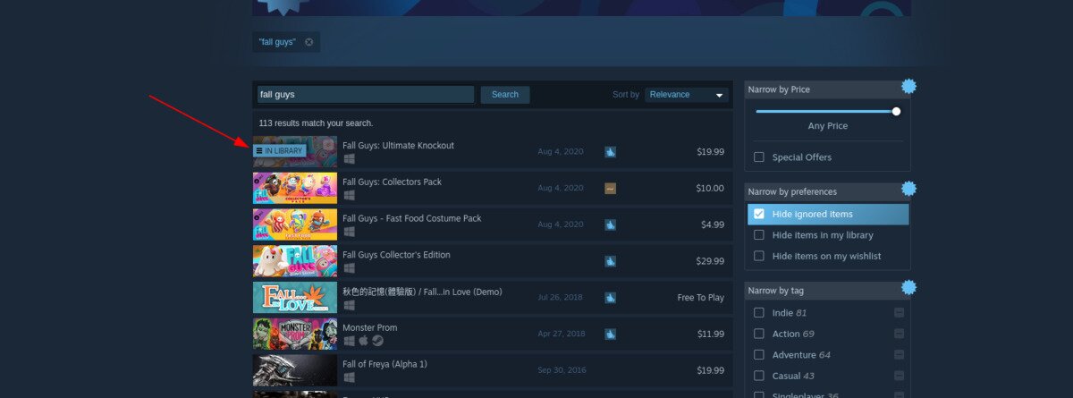 Step 2: Locate the “STORE” button at the top of Steam, and click on it with the mouse to access it. Once on the “STORE” page, find the search box, and click on it. After that, search for “Fall Guys” and click on “Fall Guys” in the search results.